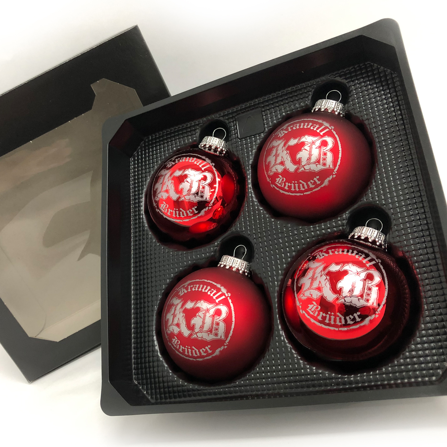 Das Set enthält zwei matte und zwei glänzende KB Weihnachtskugeln aus Glas!